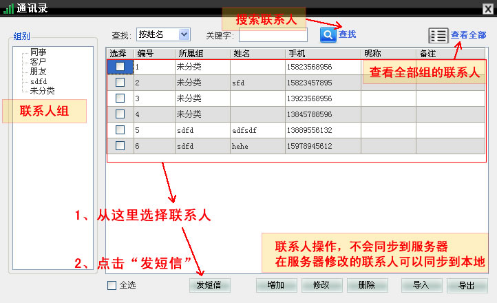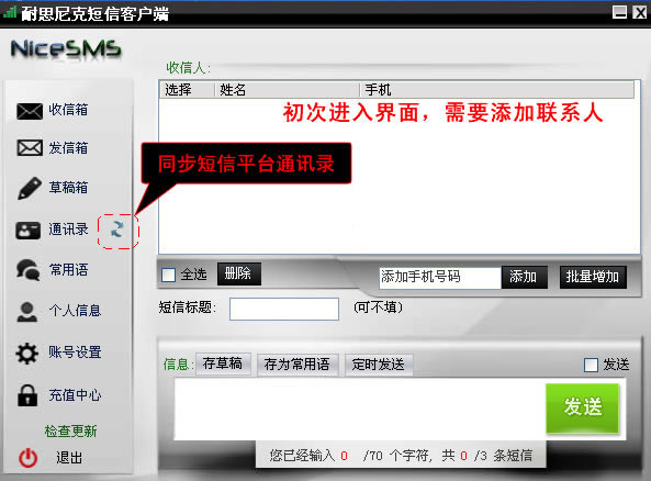 第三步,初次进入界面需要添加联系人,如果短信平台已经有联系人,可以使用“同步联系人”功能将联系人同步到客户端